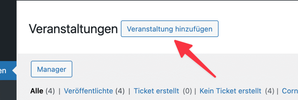 Nun siehst du alle deine Veranstaltungen. Klicke auf den Button „Veranstaltung hinzufügen“.