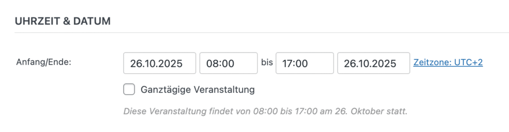 Bei „Uhrzeit und Datum“ gibst du Beginn und Ende der Veranstaltung ein.