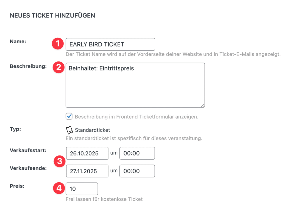 Gib den Namen des Tickets ein, z. B. VVK-TICKET 31.12.2025.