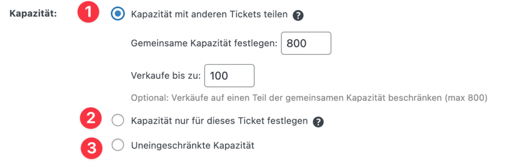 • Gemeinsame Kapazität: Gesamtanzahl der verfügbaren Plätze (z. B. 1000 Personen). (Nur beim ersten Ticket ausfüllen!)